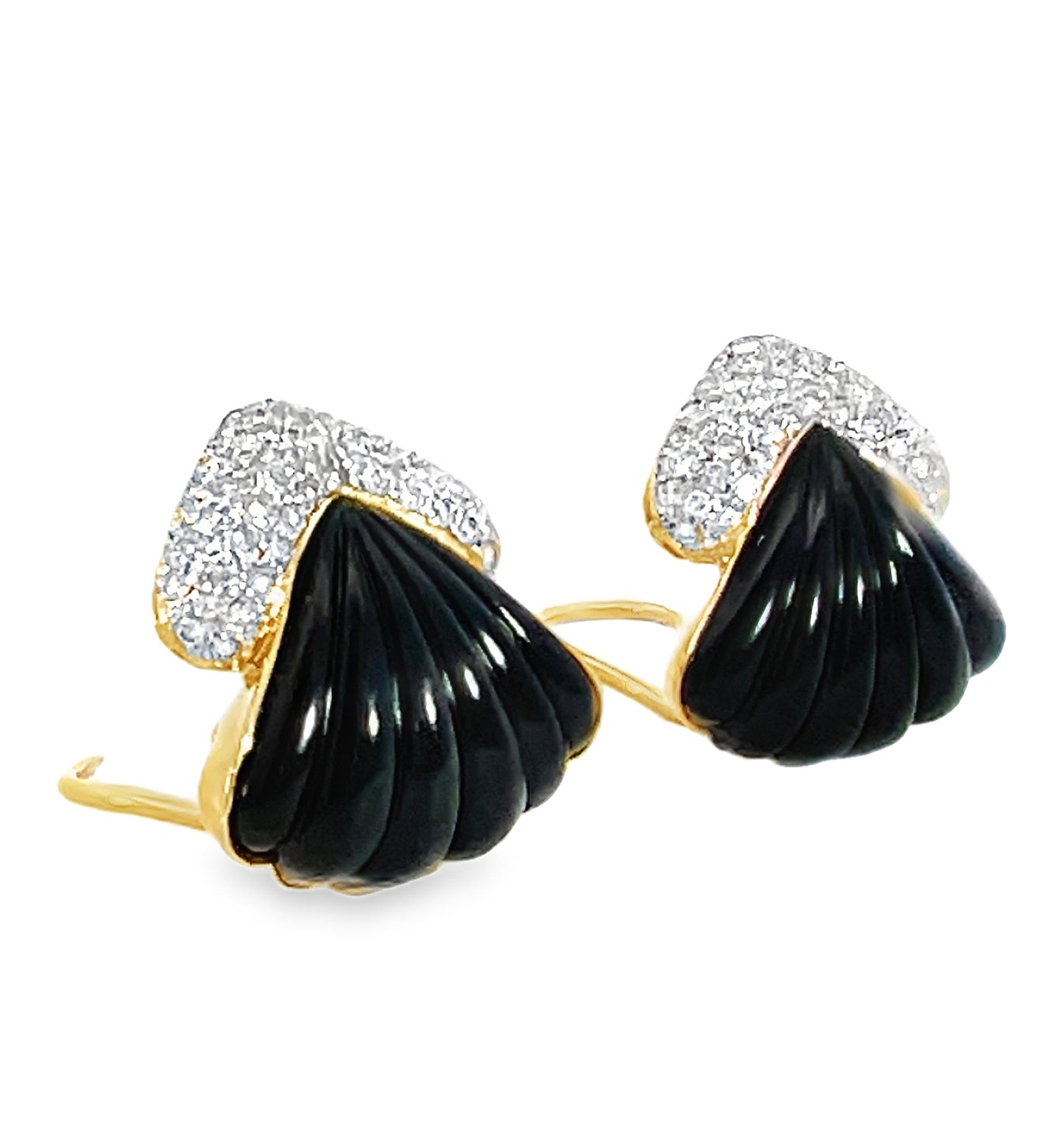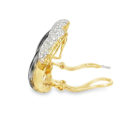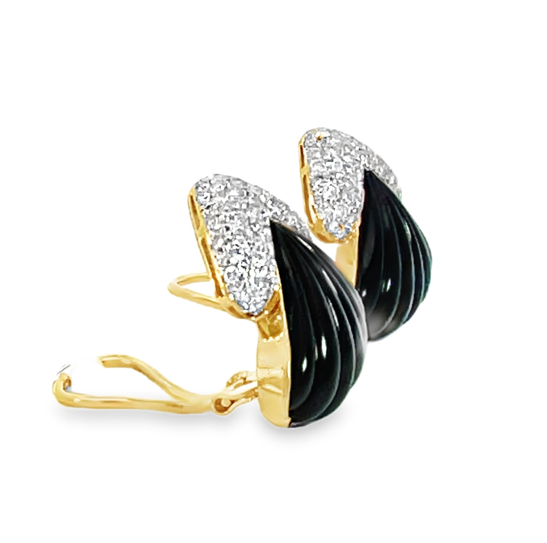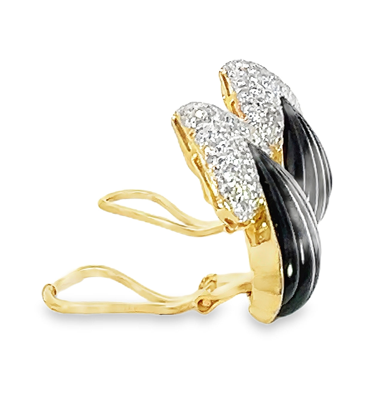 Discover the perfect fusion of elegance and bold design with these vintage 18K yellow and white gold earrings, featuring a striking black onyx shell accented with 114 round brilliant cut diamonds totaling 2.00 carats. The deep, glossy black onyx contrasts beautifully against the warm glow of 18K gold, creating a sophisticated and timeless aesthetic.