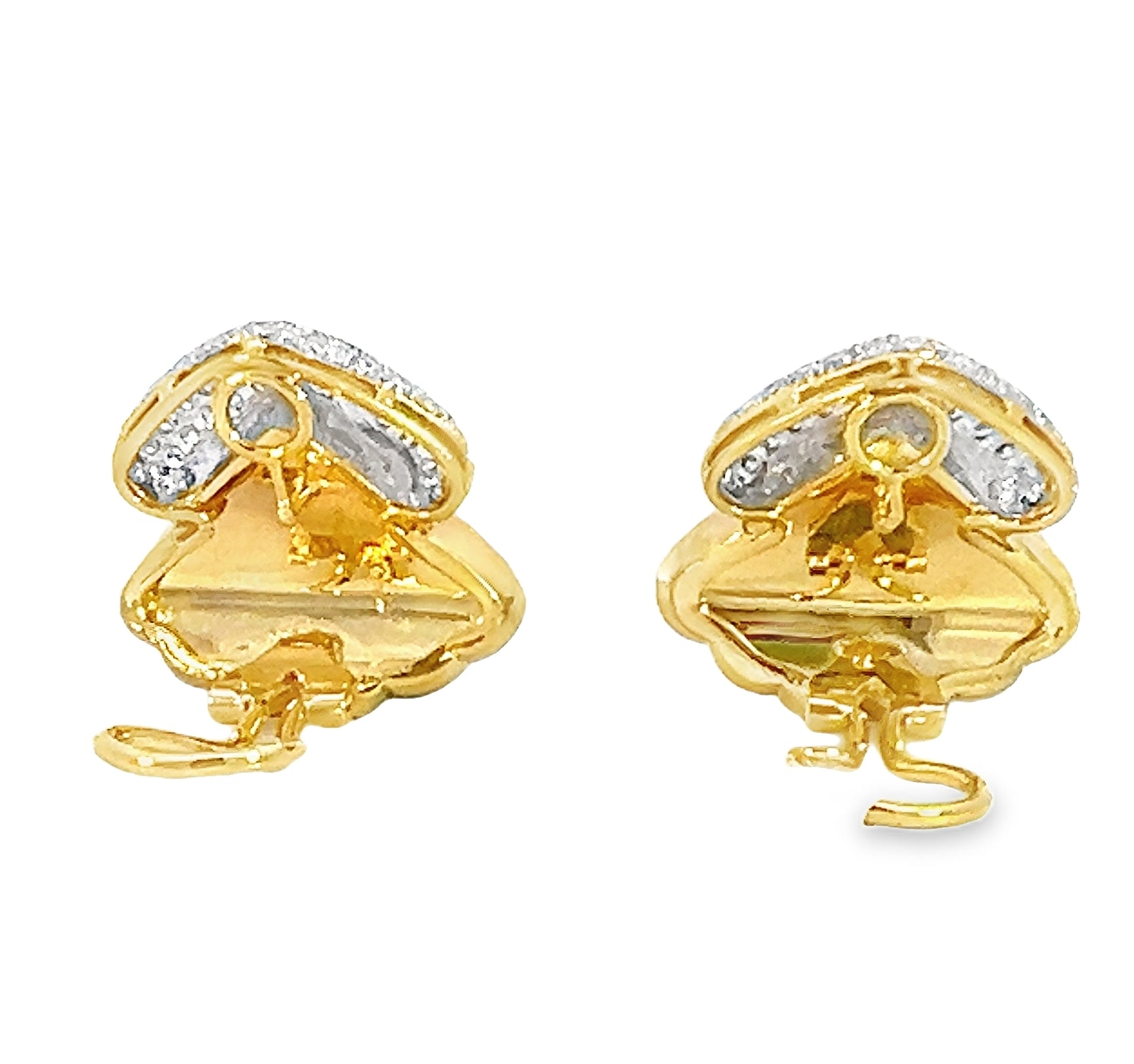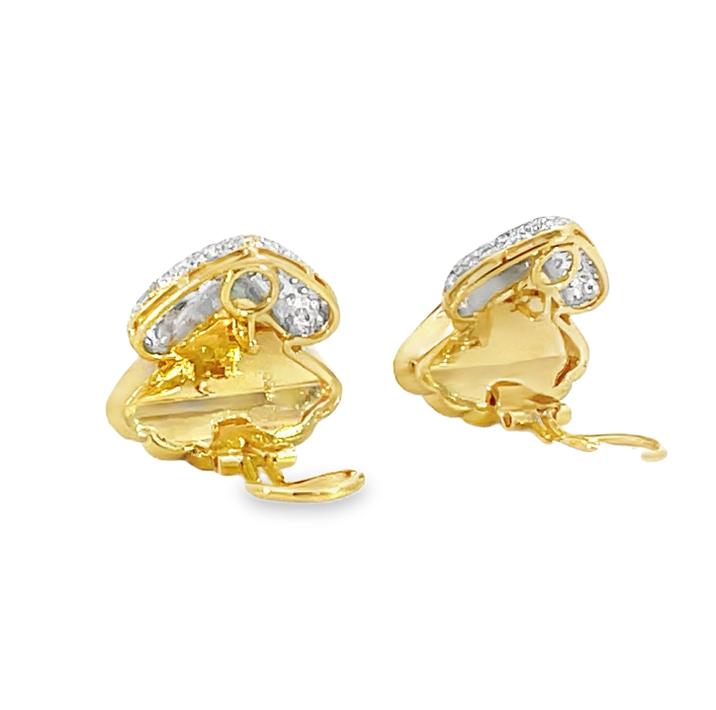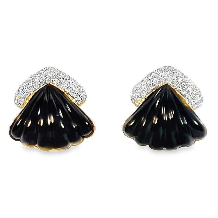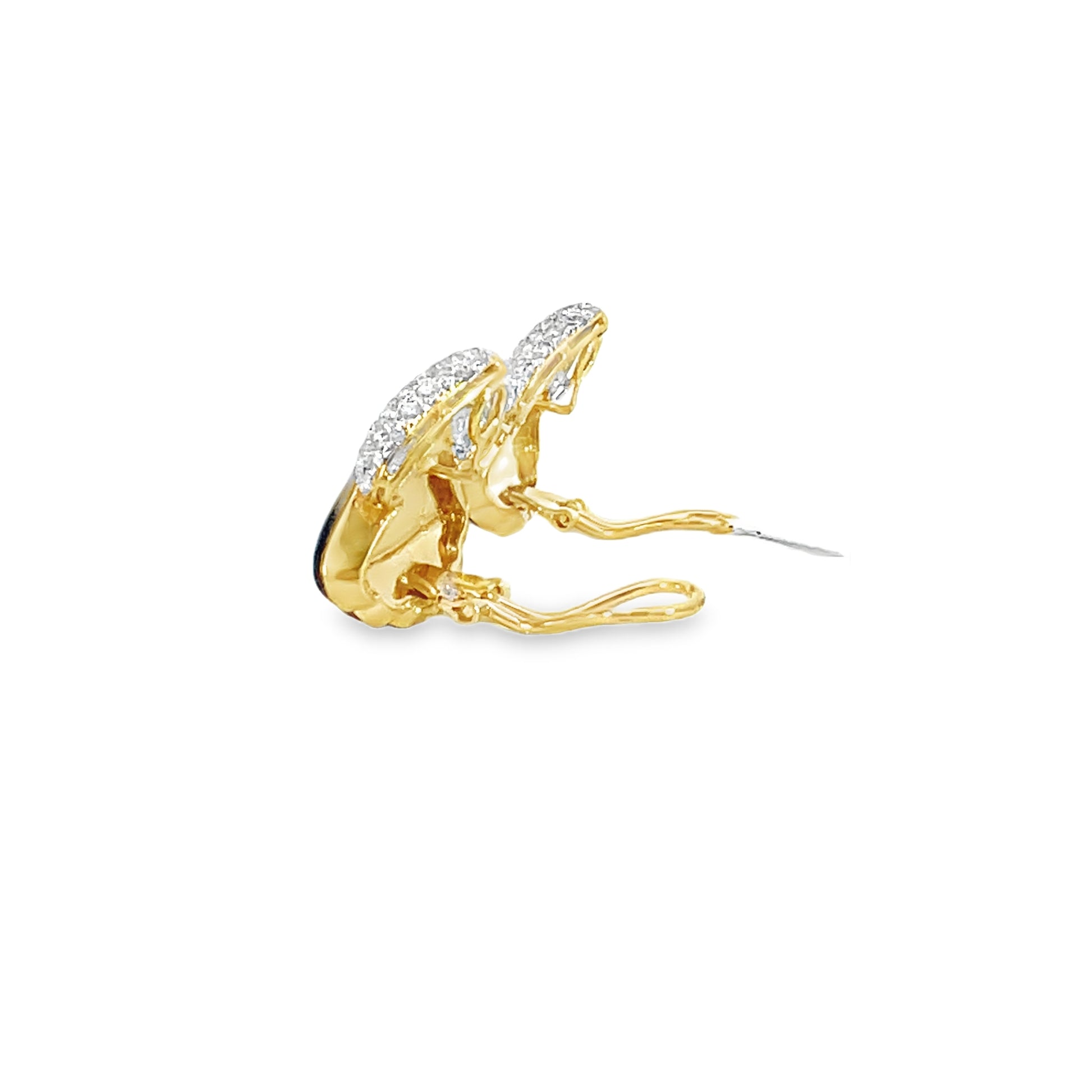 Discover the perfect fusion of elegance and bold design with these vintage 18K yellow and white gold earrings, featuring a striking black onyx shell accented with 114 round brilliant cut diamonds totaling 2.00 carats. The deep, glossy black onyx contrasts beautifully against the warm glow of 18K gold, creating a sophisticated and timeless aesthetic.