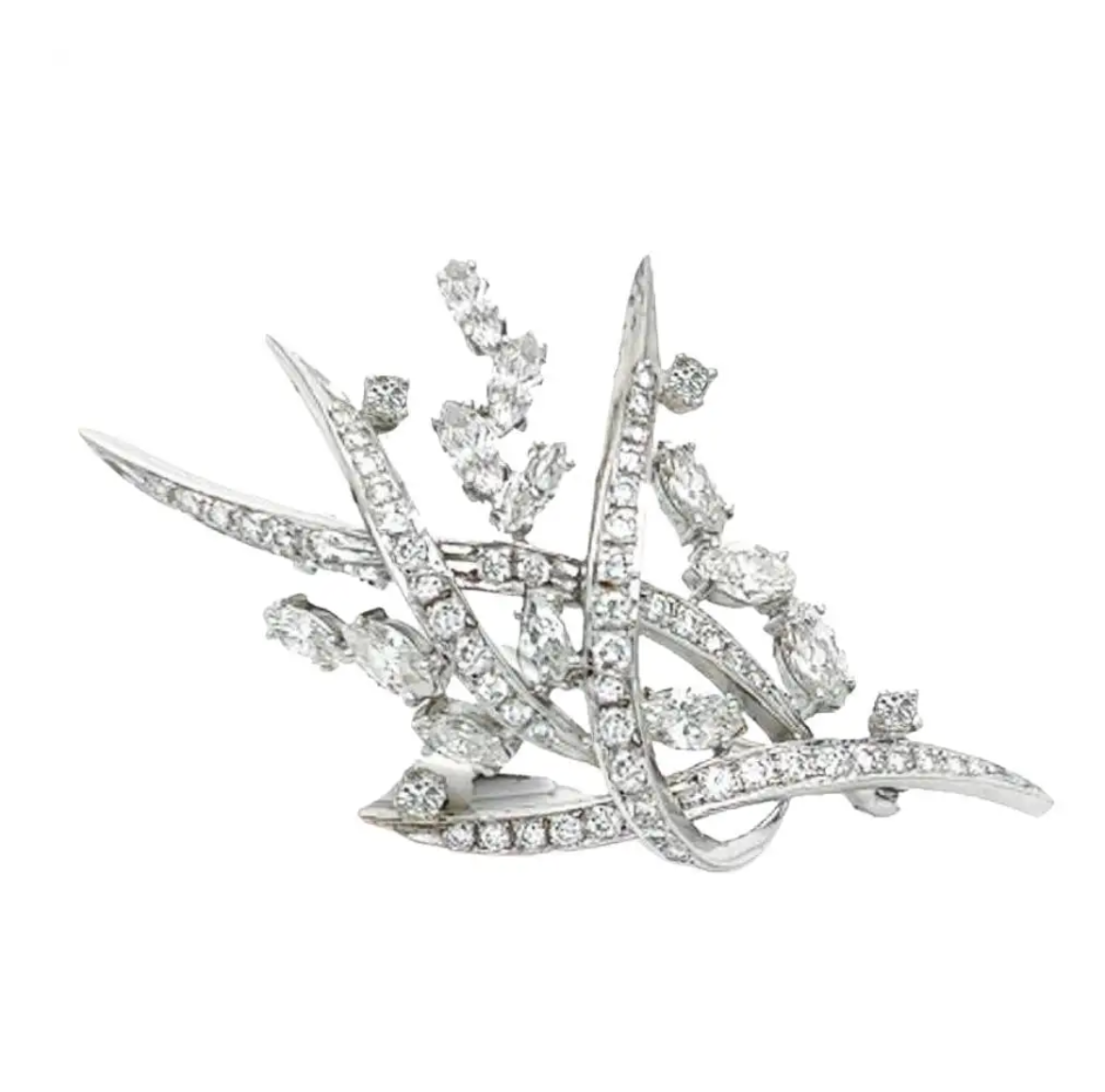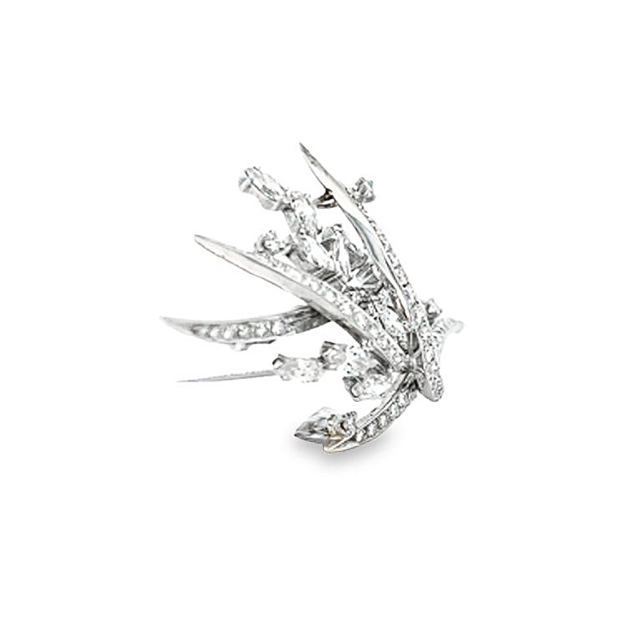 Vintage 14 karat white gold art deco brooch with round brilliant and marquis shaped diamonds. There are 58 diamonds totaling 3.63 carats. 12 marquise weighing 2.30 carats and 48 round brilliants weighing 1.33 carats