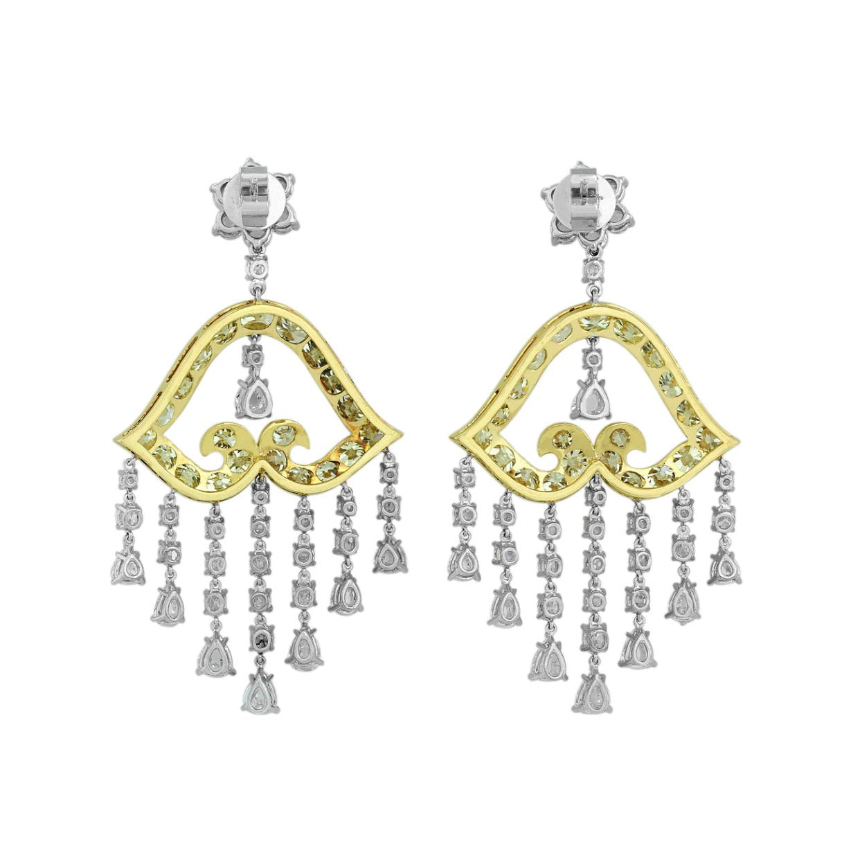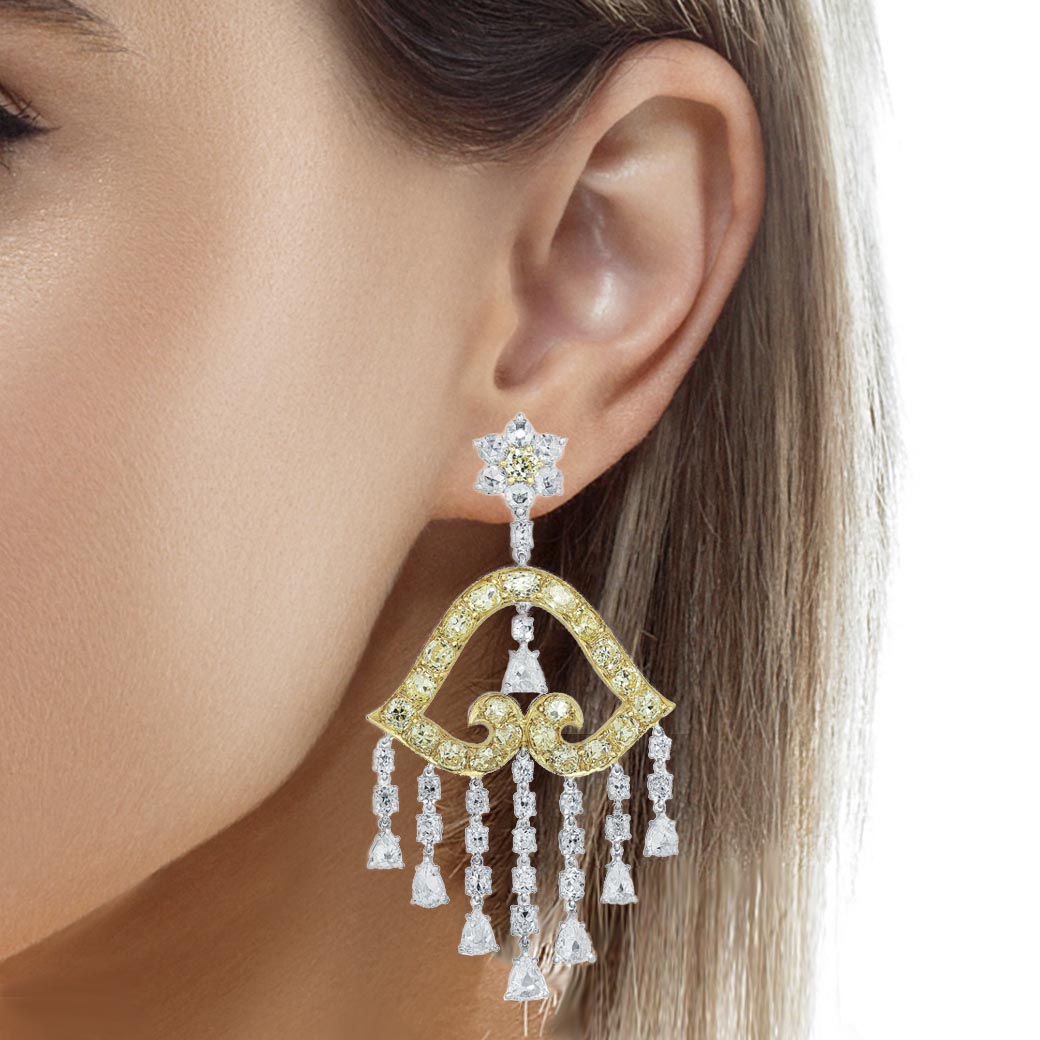 Impressive 27.90 carats of yellow diamond and white diamond chandelier earrings crafted in platinum and 18 karat yellow gold. The earrings have 13.89 carats of fancy yellow diamonds set in 18 karat yellow gold and 13.01 carats of white diamonds set in platinum.