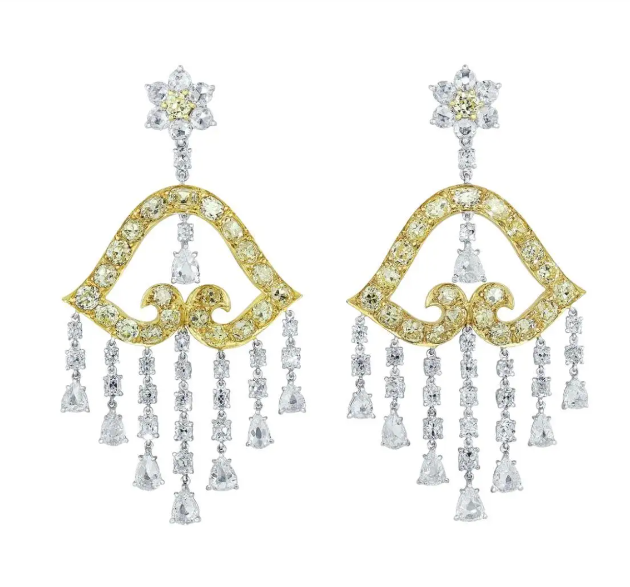 The earrings are designed with white diamond flower petals and a yellow diamond flower center. Connected with a single round brilliant diamond is a beautifully shaped bell crafted in 18 karat yellow gold with striking yellow diamonds. Suspended from the bottom of the bell are round brilliant shape diamonds and pear-shaped rose-cut diamonds.